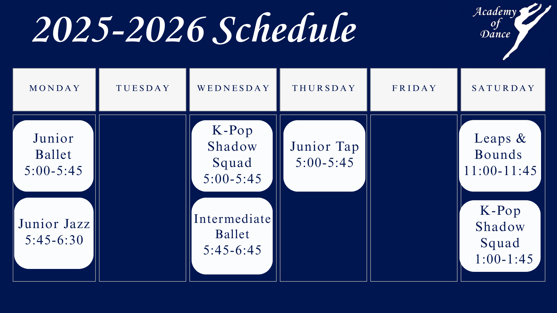 2025-2026 Registration is NOW OPENGo to https://www.jubilationstudios.com/ to register for senior and adult classes REGISTER HERE Magic in Motion (3-4) Leaps & Bounds (5-6) Junior (7-10) Intermediate (11-14)