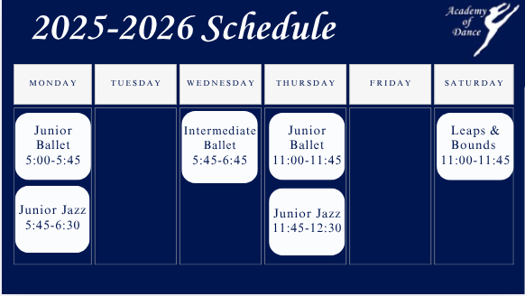 2025-2026 Registration is NOW OPENGo to https://www.jubilationstudios.com/ to register for senior and adult classes REGISTER HERE Magic in Motion (2-4) Leaps & Bounds (5-6) Junior (7-10) Intermediate (11-14)